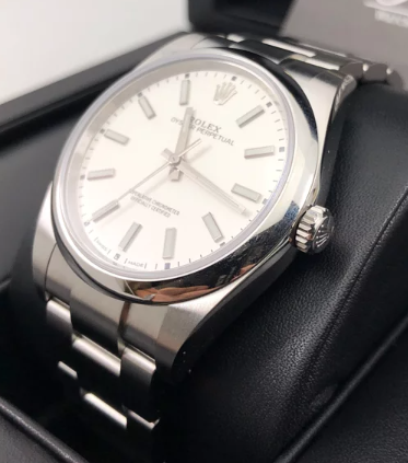 The Oyster Perpetual 34?Ref.?114200 with a white dial is a minimalist, no-date classic? versatile for both casual and dressy settings. Its clean dial and elegant proportions make it perfect for someone who wants a timeless everyday Rolex with a traditional, elegant presence on the wrist.