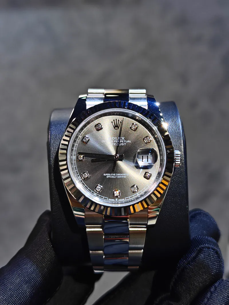 A classic Rolex Datejust 41 that perfectly blends timeless elegance with modern precision ? featuring a dark rhodium/grey sunburst dial with factory diamond hour markers, an 18?ct white gold fluted bezel, and a durable Oystersteel 41?mm case and bracelet.