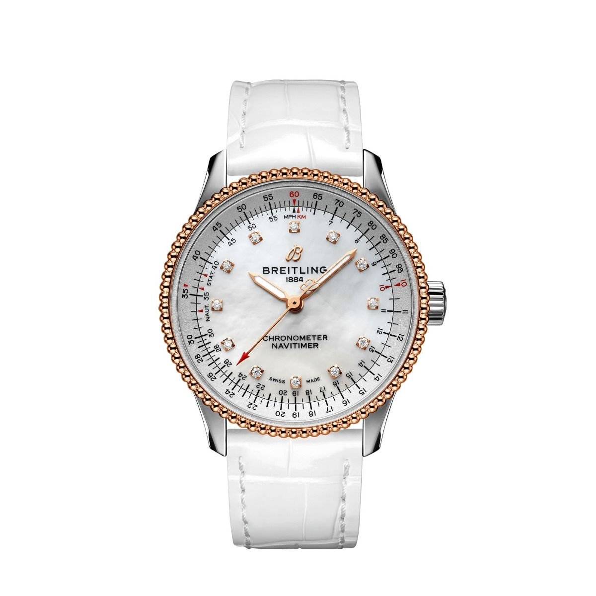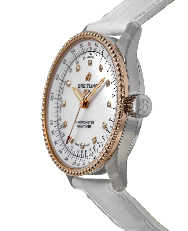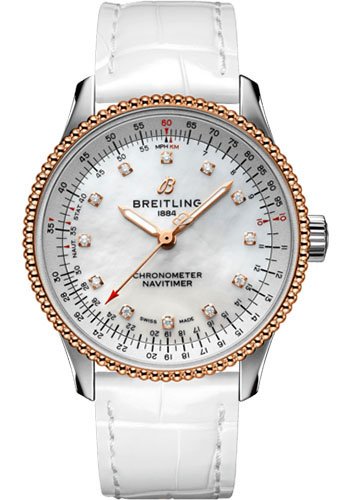 Step into luxury with the Breitling Navitimer REF U17395211A1P4. Chronometer Specifications: Reference number U17395211A1P3 Brand: Breitling Model: Navitimer Movement: Automatic Case material: Gold/Steel, Steel Bracelet material: Crocodile skin, Leather Gender : Women?s chronometer Movement: Automatic Case diameter:35.0 mm Water resistance : 3 ATM Crystal Sapphire :crystal Dial :Mother of pearl Bracelet/strap Bracelet material : Crocodile skin, Leather Bracelet color: White Clasp material: Steel Part of our curated collection, ensuring quality and authenticity.