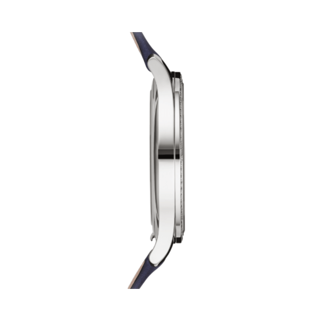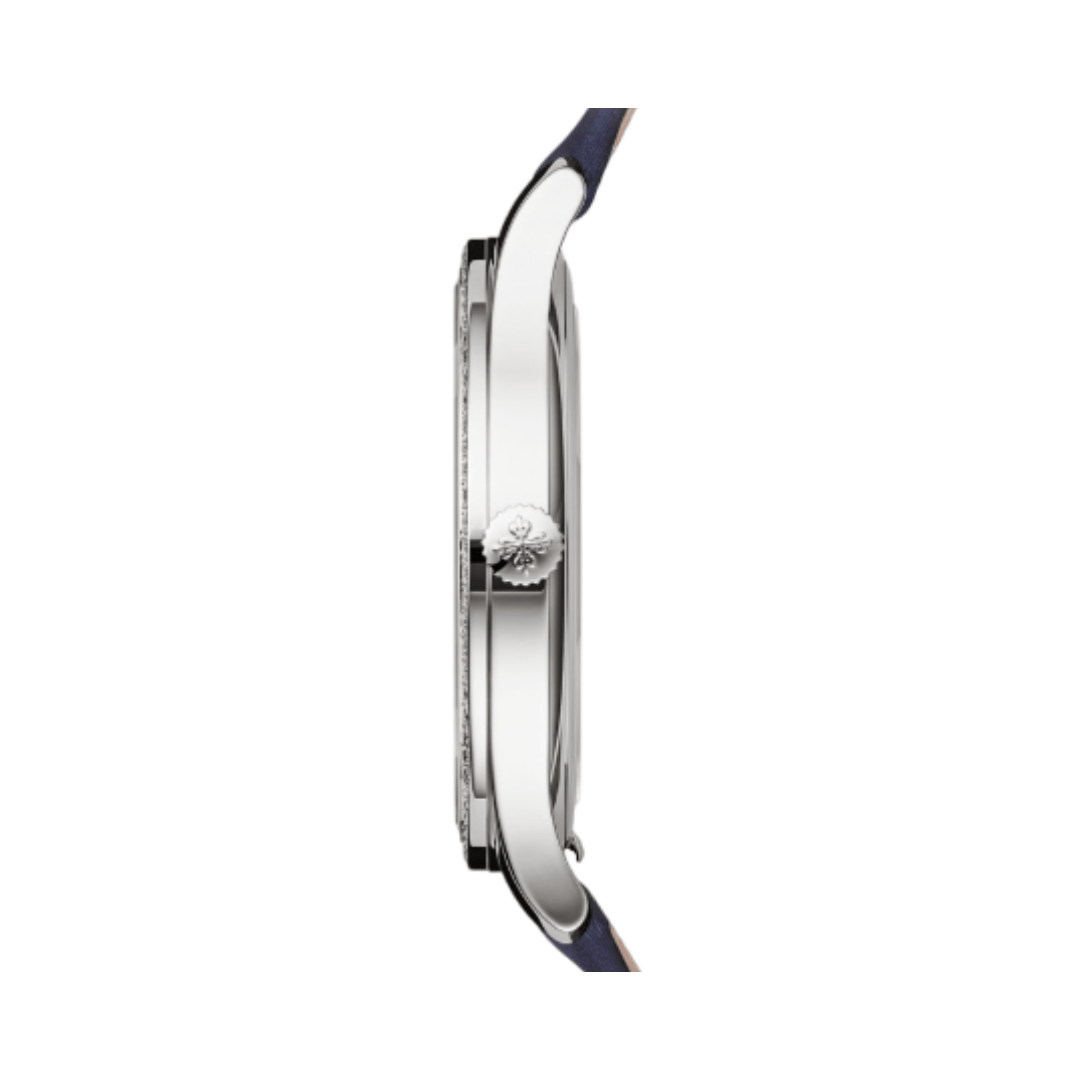 Unveil the magnificence of the Patek Philippe Calatrava 4997/200G-001 Blue Dial Diamond Bezel 18K White Gold Blue Satin Straps. The Patek Philippe Calatrava 4997/200G-001 is a beautiful watch designed for women that perfectly blends heritage style with exceptional craftsmanship. It features an eye-catching blue dial, a bezel adorned with sparkling diamonds, and a comfortable satin strap, making it a symbol of elegance and exclusive. Design and Materials This watch has a circular case created from 18 karat white gold, giving it a luxurious and long-lasting sensation. The case has a diameter of 35mm and a sleek thickness of 7.4mm. The durable sapphire crystal covering the dial is resistant to scratches, ensuring clear vi… Join thousands of satisfied customers who trust for luxury watches.