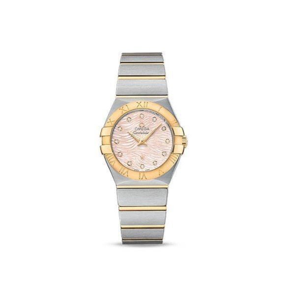 Embrace timeless elegance with the Omega Constellation Stainless Steel 27Mm Ladies Watch. WATCH SPECIFICATIONS: 27 mm stainless steel case, sapphire back, 18k yellow gold bezel with engraved roman numerals, domed scratch-resistant sapphire crystal with anti-reflective treatment inside, pink mother-of-pearl dial with a wavy pattern that flows between the iconic claws and 12 diamond indexes, caliber 1376 quartz movement with rhodium-plated finish, approximately 48 months of power reserve, stainless steel bracelet with 18K gold links. Water resistant to 10 bar. Discover more premium timepieces in our collection.