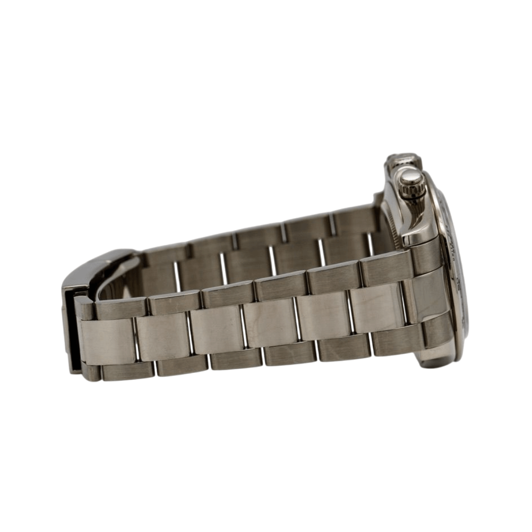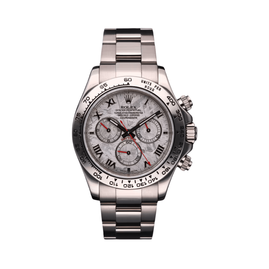 Appreciate the artistry of the Rolex Cosmograph Daytona 116509-MTAO Oyester Perpetual Meteorite Roman Dial. The Rolex Cosmograph Daytona 116509-MTAO is a vintage-inspired men?s watch designed for those who appreciate luxury and precision. This Oyster Perpetual timepiece boasts a stunning meteorite Roman dial that offers a unique and sophisticated look. Crafted in Switzerland, it represents Rolex?s unparalleled craftsmanship and attention to detail. Premium Materials The watch features a 40mm case size made from white gold, ensuring durability and a luxurious finish. Its bezel is also crafted from white gold and designed as a tachymeter, adding both function and style. The sapphire crystal protects t… Backed by ‘s commitment to quality and customer satisfaction.