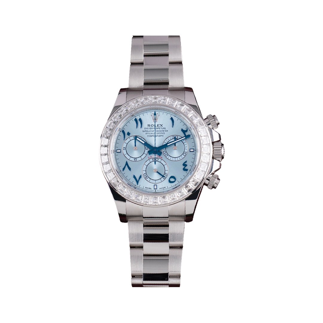 Step into luxury with the Rolex Cosmograph Daytona 126576TBR Platinum Baguette Bezel 40mm Blue Arabic Dial Men?s Watch. The Rolex Cosmograph Daytona 126576TBR is a magnificent platinum masterpiece with a sparkling baguette diamond bezel, adding to its luxury appeal. This 40mm men?s horological masterpiece features a brilliant blue Arabic dial for a stylish yet classic look. The Rolex Cosmograph Daytona is renowned for its precision and sporting elegance, combining high-performance chronograph capabilities with superb craftsmanship. Its in-house Calibre 4131 movement provides remarkable accuracy and reliability. The Rolex Cosmograph Daytona 126576TBR is not only a mark of status but also a coveted collector?s it… Experience exceptional service and authenticity.