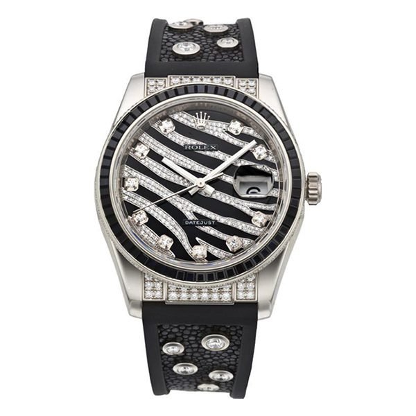 Indulge in the sophistication of the Rolex Datejust 116199 Sanr Royal Black 60 Baguette Black Sapphires Bezel Black & Diamond Paved Dial 36Mm White Gold Galuchat Straps Ladies Watch. Rolex Datejust 116199 SANR Royal Black 60 Baguette Black Sapphires Bezel Black & Diamond Paved Dial 36mm White Gold Galuchat Straps Ladies Watch Rolex Datejust 116199 SANR features 36mm 18K white gold case, bezel set with 60 baguette black sapphires, bezel edge and endpieces set with diamonds, black and diamond paved dial, diamond hour markers, and black rubber and galuchat strap set with 10 diamonds. Experience exceptional service and authenticity.