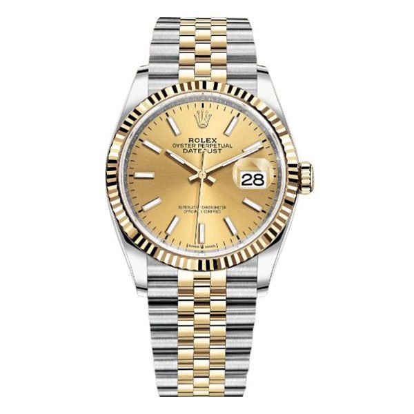 Unveil the magnificence of the Rolex Datejust 126233-0015 Fluted Bezel Oystersteel Yellow Gold 36mm Champagne Index Dial Women?s Watch. Rolex Datejust 126233 CHIJ Champagne Index Dial Fluted Bezel 36mm Oystersteel and Yellow Gold Unisex Rolex Datejust 126233-0015 features a polished 904L Oystersteel stainless steel case and polished solid 18k yellow gold with brushed 904L Oystersteel stainless steel Jubilee bracelet. Polished solid 18k yellow gold fluted bidirectional rotating bezel. Champagne dial with Chromalight blue luminescent hands and index hour markers. Date displayed under Cyclops lens in window at 3 o?clock with instantaneous date and rapid setting. Stop-seconds feature for precise time setting. Powered by the Rolex … Experience exceptional service and authenticity.