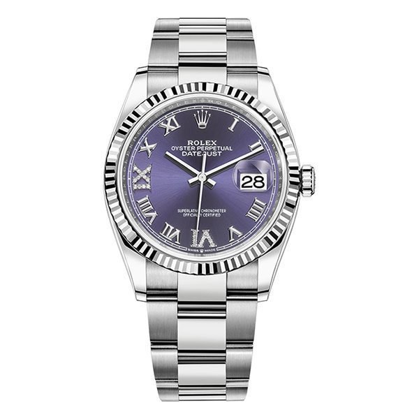 Rolex Datejust 126234 Aubergine Roman VI and IX Diamonds Dial 36mm Stainless Steel Oyster Bracelet Ladies Watch Rolex Datejust 126234 Aubergine 36mm Oystersteel case, screw-down steel back, screw-down crown with twinlock double waterproofness system, fluted? Available – your luxury watch destination.