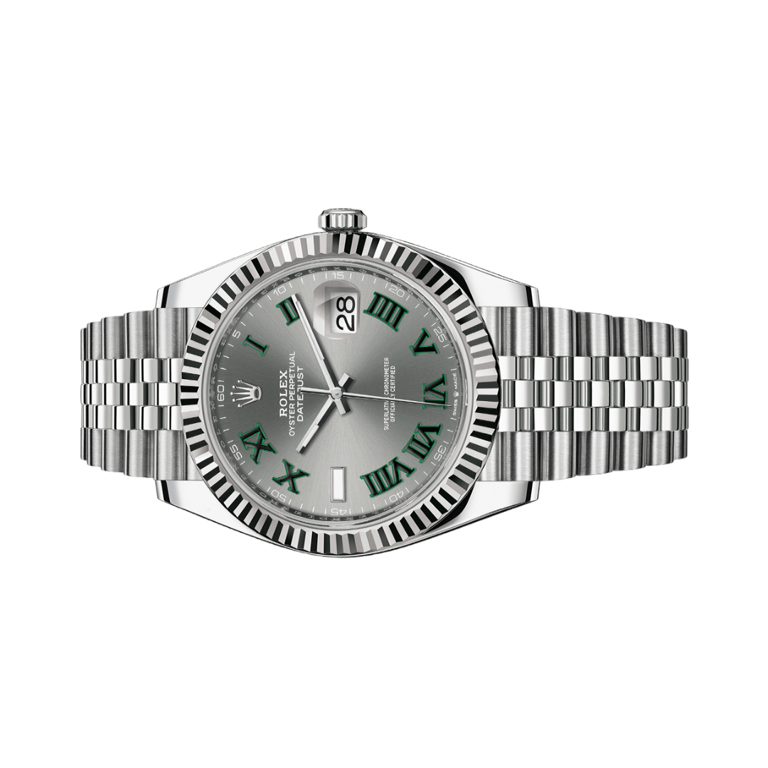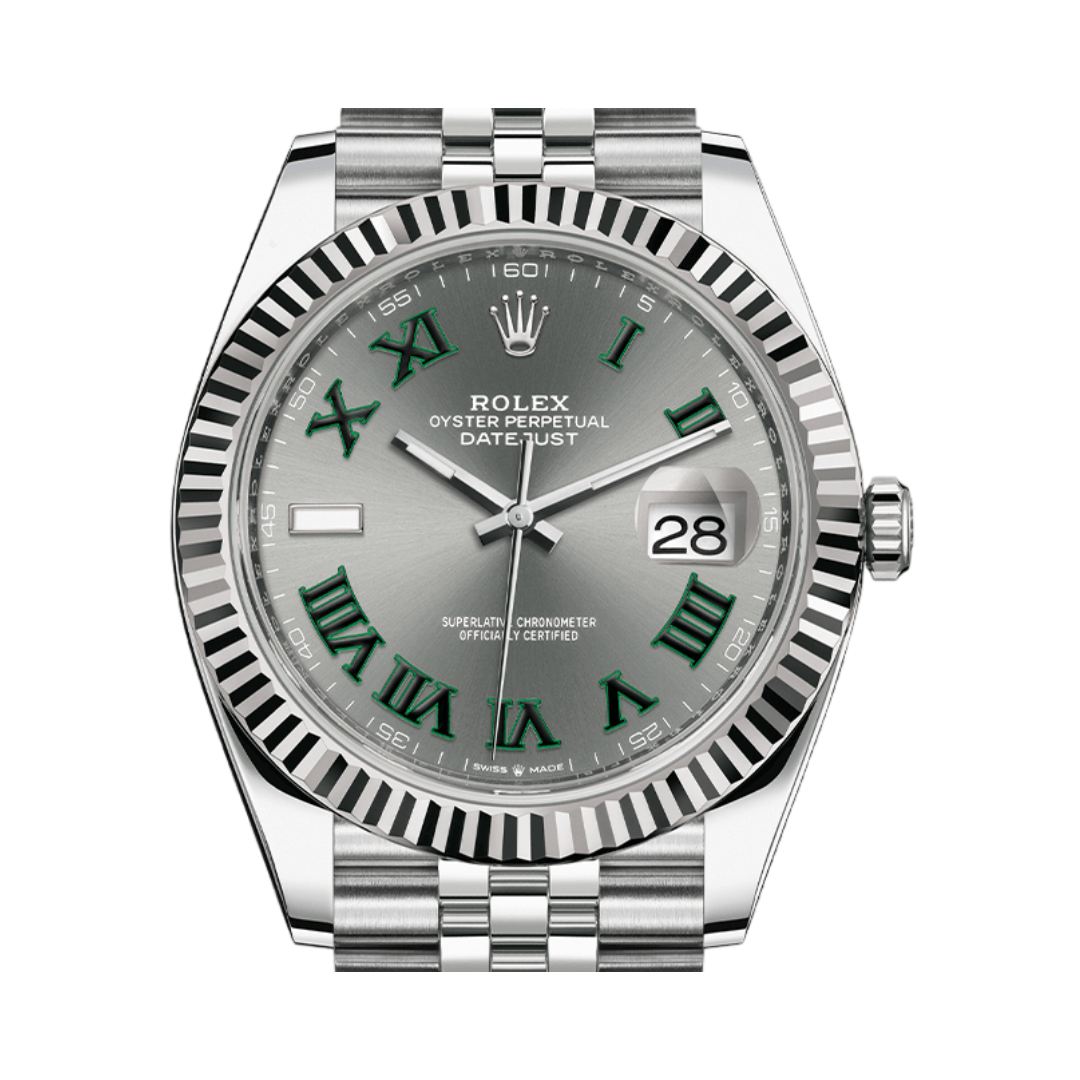 Experience luxury with the Rolex Datejust 126334-0022 SLGRJ Wimbledon White Gold Slate Grey Roman Dial. The Rolex Datejust 126334-0022 SLGRJ is a exclusive watch known for its timeless design and precision. It features a 41mm white Rolesor case, which is made of 904L Oystersteel and 18K white gold. The fluted bezel in 18K white gold adds a touch of elegance. The horological masterpiece has a scratch-resistant sapphire crystal with a Cyclops lens over the date for better visibility. Sophisticated Slate Dial This Rolex Datejust Wimbledon model features a slate grey dial with green Roman numerals, also known as the ?Wimbledon? dial. The combination of colors enhances readability and gives the watch… Part of our curated collection, ensuring quality and authenticity.