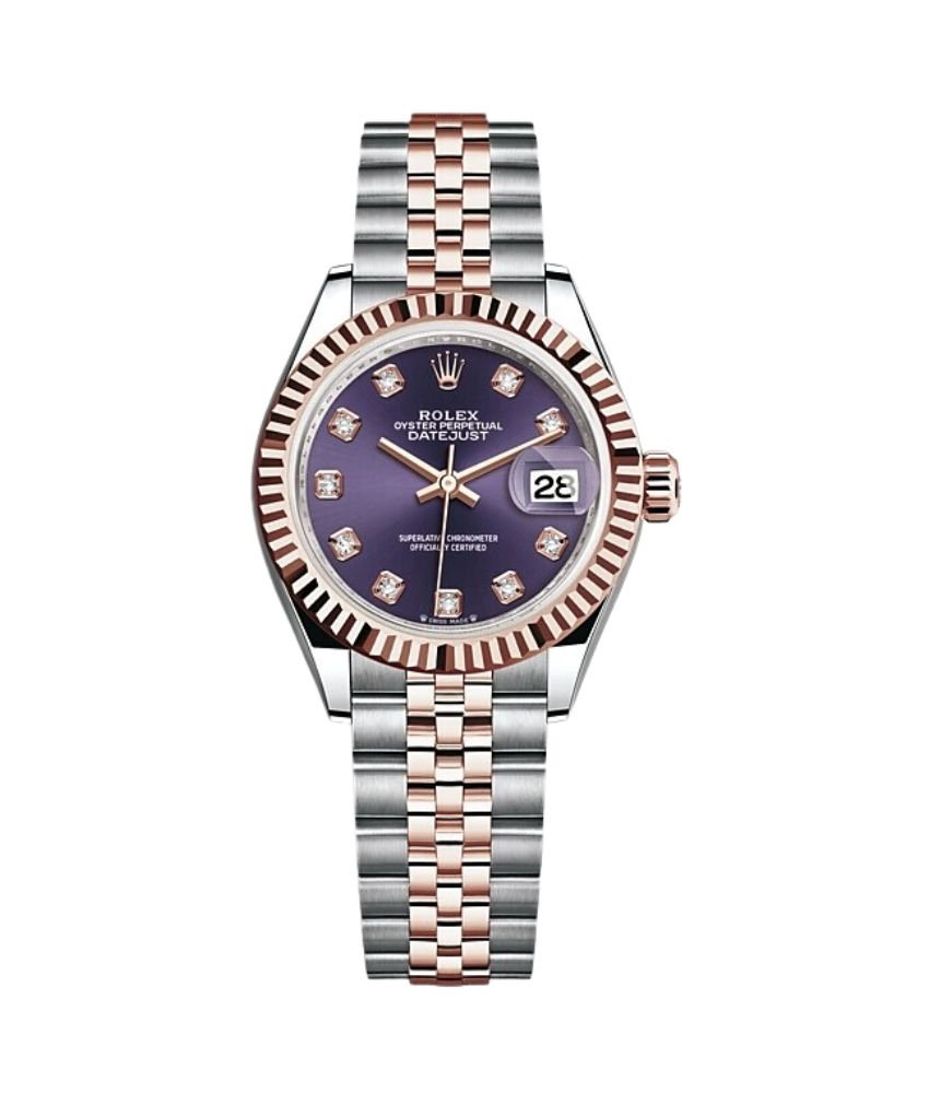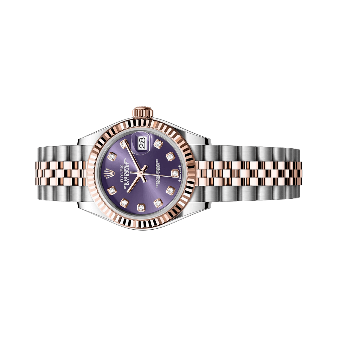 Unveil the magnificence of the Rolex Lady Datejust 279171-0015 Steel with Rose Gold 28mm Aubergine Diamond Purple Dial Womens Watch. The Rolex lady Datejust 279171-0015 is a 28 mm timepiece crafted with a combination of Oystersteel and Everose gold. Designed for women who appreciate timeless elegance, this watch is a true reflection of Rolex?s exceptional craftsmanship and attention to detail. Distinctive Aubergine Dial At the heart of this Rolex lady Datejust watch is its Aubergine dial, which serves as the distinctive face of the timepiece. The dial features hour markers made from gold to ensure they do not tarnish over time. Each Rolex dial is meticulously designed and handcrafted in-house, guaranteeing unmatched perfect… Discover more premium timepieces in our collection.