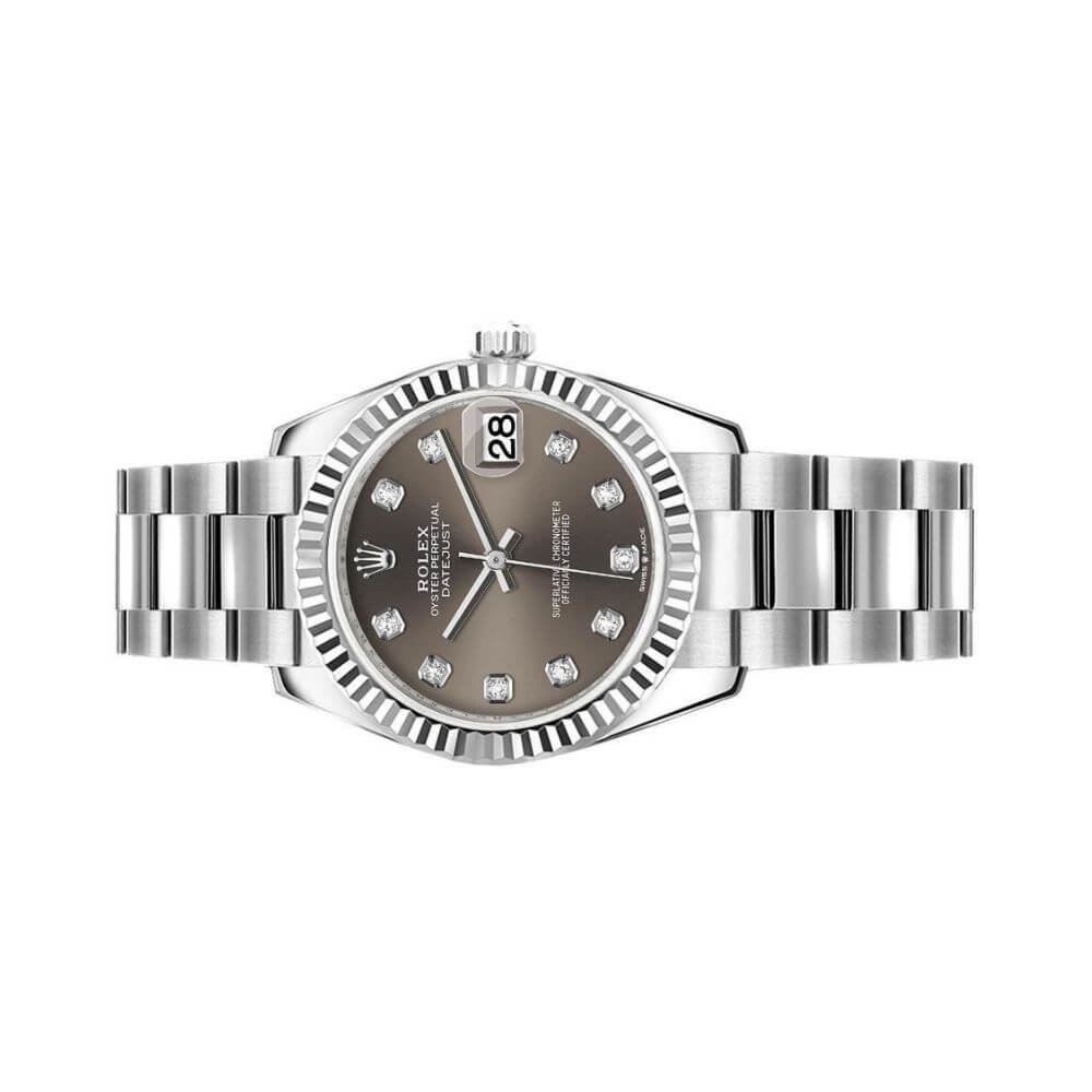 Celebrate exceptional design with the Rolex Datejust 31 M278274-0007 OysterSteel And White Gold Grey Dial. The Rolex Datejust 31 m278274-0007 Ladies Watch is known for its exceptional craftsmanship and exquisite design. With a 31mm stainless steel case, it is the outstanding size for women who appreciate a refined and sophisticated look. The dark grey dial, adorned with diamond hour markers, adds a touch of glamour to this remarkable watch. Let?s explore the features and specifications of this stunning Rolex Datejust model. Elegant Design and Dial The dark grey dial of the Rolex Datejust 31 m278274-0007 exudes elegance and simplicity. Its minimalist design allows for easy readability, while the dia… Discover more premium timepieces in our collection.