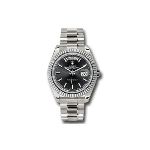 Command attention with the Rolex Day Date 18Kt White Gold 40Mm Men?S Watch. 40mm 18K white gold case, screw-down back with Rolex fluting, screw-down crown with twinlock double waterproofness system, fluted bezel, scratch-resistant double anti-reflective sapphire crystal with cyclops lens over the date, black dial, index hour markers with Chromalight, Rolex calibre 3255 automatic movement with centre hour, minute and seconds hands, instantaneous day and date in apertures, unrestricted rapid-setting, and stop-seconds for precise time setting, approximately 70 hours of power reserve, President bracelet with three-piece solid links comprised of a polished center link, satin-finished outer links, and ceramic inserts, concealed folding Crownclasp buckle. Waterproof to 100 meters. Join thousands of satisfied customers who trust for luxury watches.