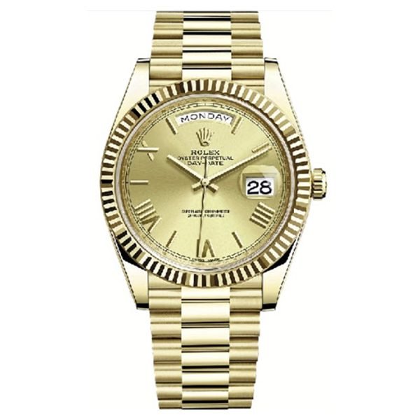 Appreciate the artistry of the Rolex Day Date 18Kt Yellow Gold Champagne Dial 40Mm Men?S Watch. WATCH SPECIFICATIONS: 40mm 18K yellow gold case, screw-down back with Rolex fluting, screw-down crown with twinlock double waterproofness system, fluted bezel, scratch-resistant double anti-reflective sapphire crystal with cyclops lens over the date, champagne dial, Roman numerals, Rolex calibre 3255 automatic movement with centre hour, minute and seconds hands, instantaneous day and date in apertures, unrestricted rapid-setting, and stop-seconds for precise time setting, approximately 70 hours of power reserve, President bracelet with three-piece solid links comprised of a polished center link, satin-finished outer links, and ceramic inserts, concealed folding Crownclasp buckle. Waterproof to 100 meters. Shop with confidence – where luxury meets authenticity.