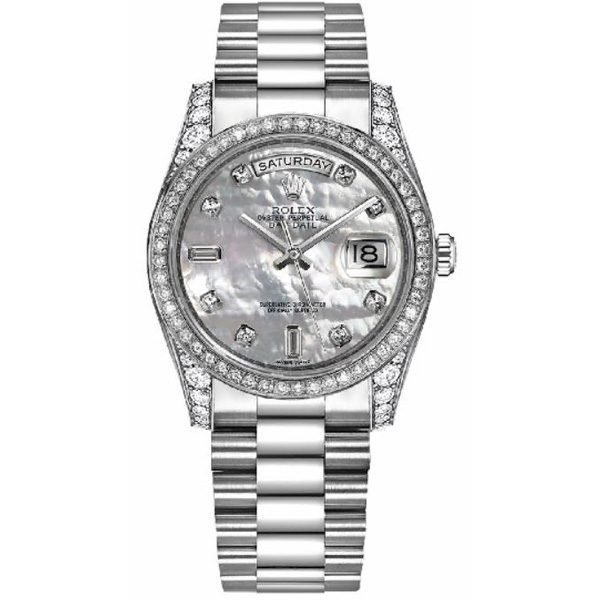 Experience luxury with the Rolex Day-Date 36 White Gold White Mother Of Pearl Diamond Dial Men?S Watch. WATCH SPECIFICATIONS Brand: Rolex Ref. 118389 WMDBP Collection: Day-Date Case Shape: Round Case Material: 18kt White Gold/Diamonds Movement: Automatic Bracelet: White Gold Crystal: Scratch resistant sapphire Dial: White Mother of Pearl Diameter: 36mm Explore our complete luxury watch collection.