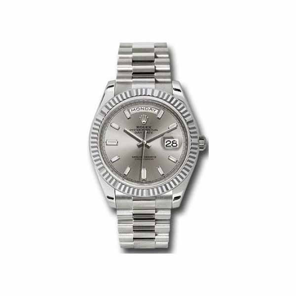 WATCH SPECIFICATIONS: 40mm 18K white gold case, screw-down back with Rolex fluting, screw-down crown with twinlock double waterproofness system, 18K white gold fluted bezel, scratch-resistant double anti-reflective sapphire crystal with cyclops lens over the date, silver dial, 10 baguette diamond hour markers, Rolex calibre 3255 automatic movement with centre hour, minute and seconds hands, instantaneous day and date in apertures, unrestricted rapid-setting, and stop-seconds for precise time setting, approximately 70 hours of power reserve, President bracelet with three-piece solid links comprised of a polished center link, satin-finished outer links, and ceramic inserts, concealed folding Crownclasp buckle. Waterproof to 100 meters.