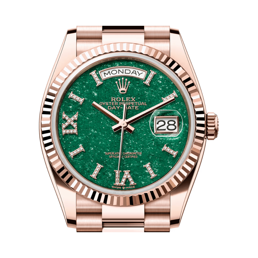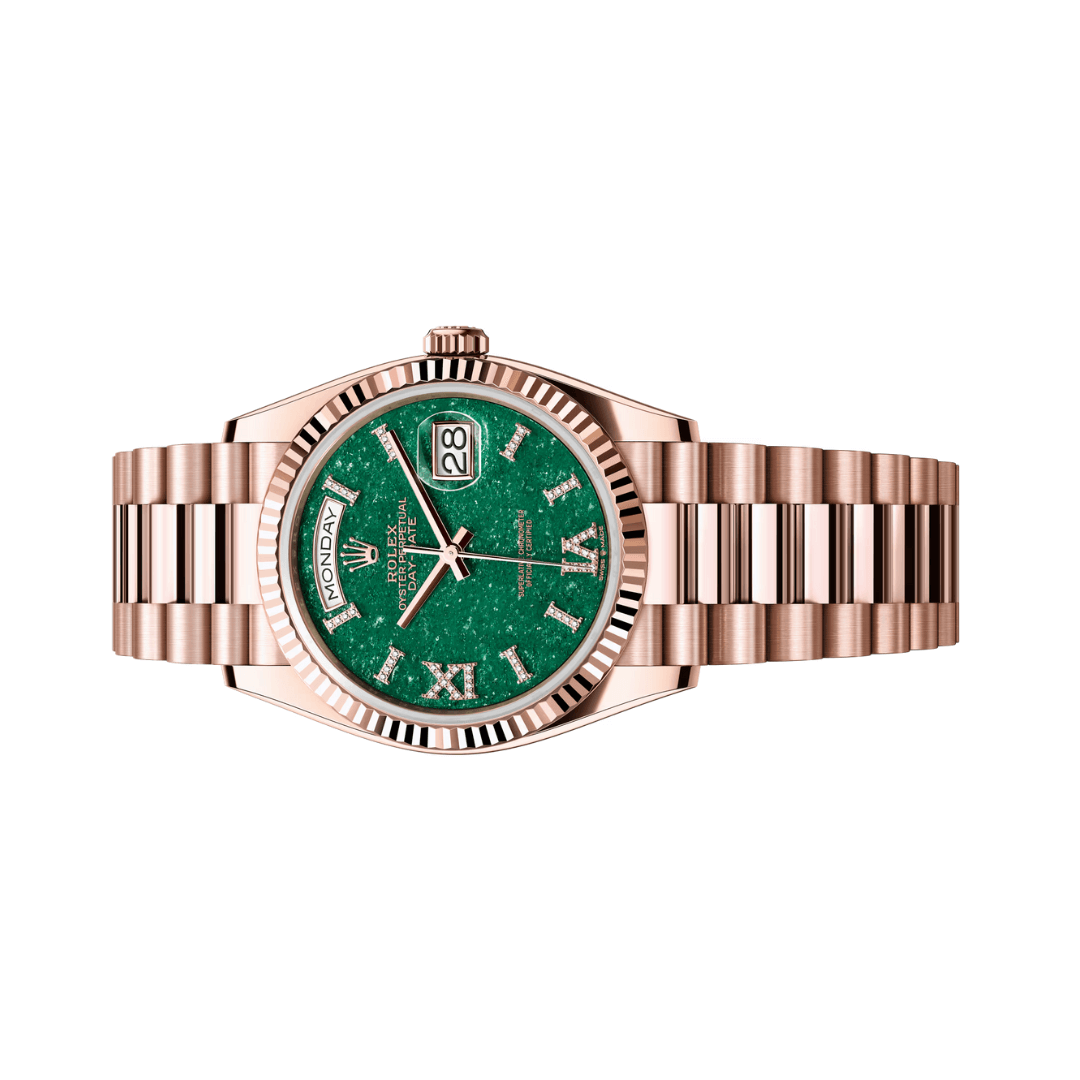 Discover the exceptional craftsmanship of the Rolex Day Date Aventurine 128235-0068 Everose Gold Green Aventurine Green Dial. The Rolex Day Date Aventurine 128235-0068 is a luxurious women?s watch made from 18kt Everose gold. It features a 36mm round case with a fluted bezel, showcasing Rolex?s signature craftsmanship. The scratch-resistant sapphire crystal with a Cyclops lens ensures clear visibility of the date. Stunning Green Aventurine Dial The green aventurine dial is set with diamond hour markers in 18kt gold, adding a sophisticated touch. The Roman VI and IX numerals are also decorated with 24 diamonds, making this watch a perfect blend of elegance and high-end. Rolex President Bracelet for Comfort This timepi… Discover more premium timepieces in our collection.