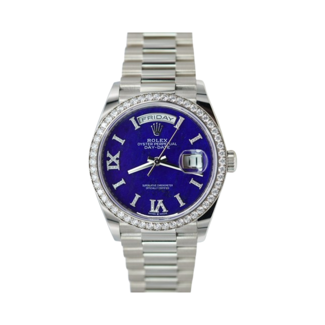 Unveil the magnificence of the Rolex Day-Date Lapis Lazuli 128349RBR White Gold Blue Dial 36mm Women?s Watch. Designed for women who value classic style, the Rolex Day-Date 128349RBR is a marvel of luxury and craftsmanship. This 36mm timepiece, which combines traditional Rolex design with contemporary elegance, is crafted in white gold and radiates prestigious. A distinctive and colorful touch is added by its eye-catching lapis lazuli blue dial, which improves readability and style. This watch, which is a part of the renowned Rolex Day-Date series, reflects Rolex?s commitment to accuracy and innovation by showing the date as well as the day of the week. The watch?s opulent appearance is enhanced by th… Shop with confidence – where luxury meets authenticity.
