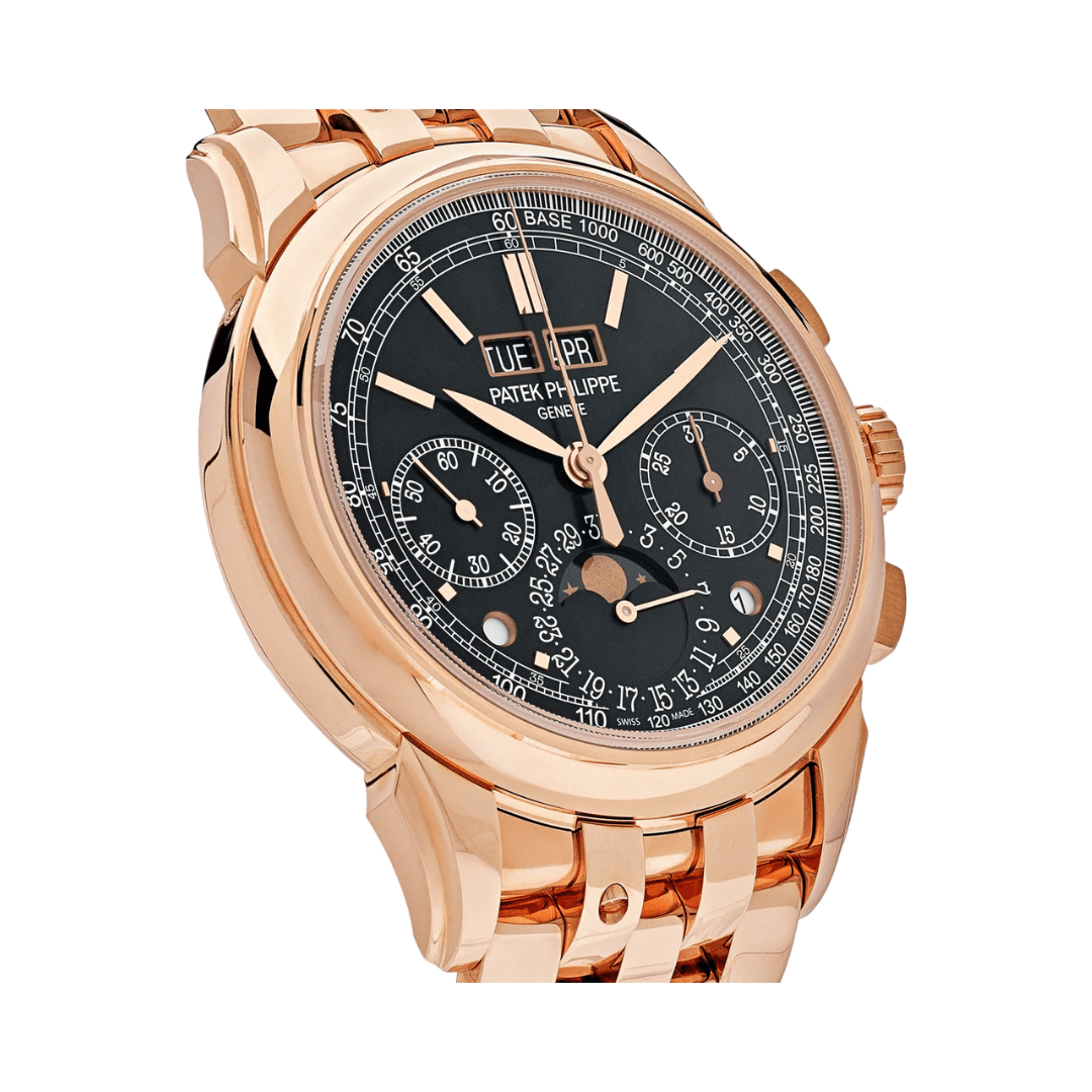 Experience unparalleled quality with the Patek Philippe Grand Complications 5270/1R-001 Chronograph Perpetual Calendar. Presenting the Patek Philippe Grand Complications 5270/1R-001 Men?s Horological masterpiece, a piece that is the epitome of expert clockwork. This men?s watch symbolises class, accuracy, and exclusive. Uniquely crafted by Patek Philippe, it boasts a special ?Goutte? bracelet made of 18kt Rose Gold that fits perfectly with the case. Design & Characteristics This luxurious 41mm horological masterpiece, labelled 5270, holds a manually operated mechanical system inside a replaceable rose gold case. The case has a solid back and a back made of sapphire crystal, presenting a delightful mix of fashio… Available exclusively, your trusted luxury timepiece destination.