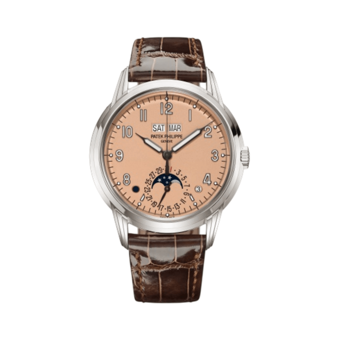Make a statement with the Patek Philippe Grand Complications 5320G-011 18K White Gold Salmon Dial 40mm Men?s Watch. Introducing the Patek Philippe Grand Complications 5320G-011 Men?s Horological masterpiece, a timeless timepiece that seamlessly blends vintage style with stylish elegance. Crafted in luxurious 18k white gold, this watch features a stunning salmon-coloured dial that adds a touch of sophistication to your wrist. This horological masterpiece is truly a masterpiece with its intricate design and impeccable attention to detail. Elegant Design The Patek Philippe Grand Complications 5320G-011 boasts a beautiful gilded opaline rose gold dial with a small day/night indicator and a leap-year cycle displ… Backed by ‘s commitment to quality and customer satisfaction.
