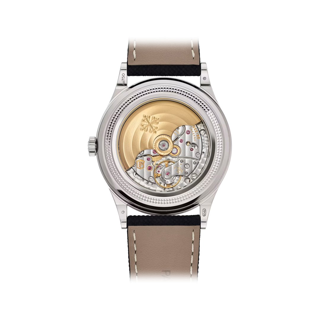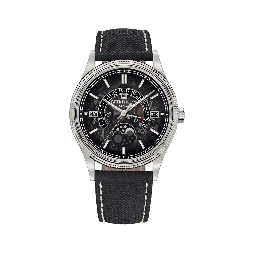 Unveil the magnificence of the Patek Philippe Grand Complications 6159G-001 Perpetual Calendar Moon Phases White Gold Smoked Sapphire Dial 39.5mm Men?s Watch. Timepiece SPECIFICATIONS: Brand: Patek Philippe Reference number: 6159G-001 Case material: White Gold Case diameter: 39.5 mm Case Shape: Round Dial Color: Grey Dial numerals: Indices Bezel Color: Silver Bracelet material: Composite fabric pattern Bracelet color: Black Movement: Automatic Experience exceptional service and authenticity.