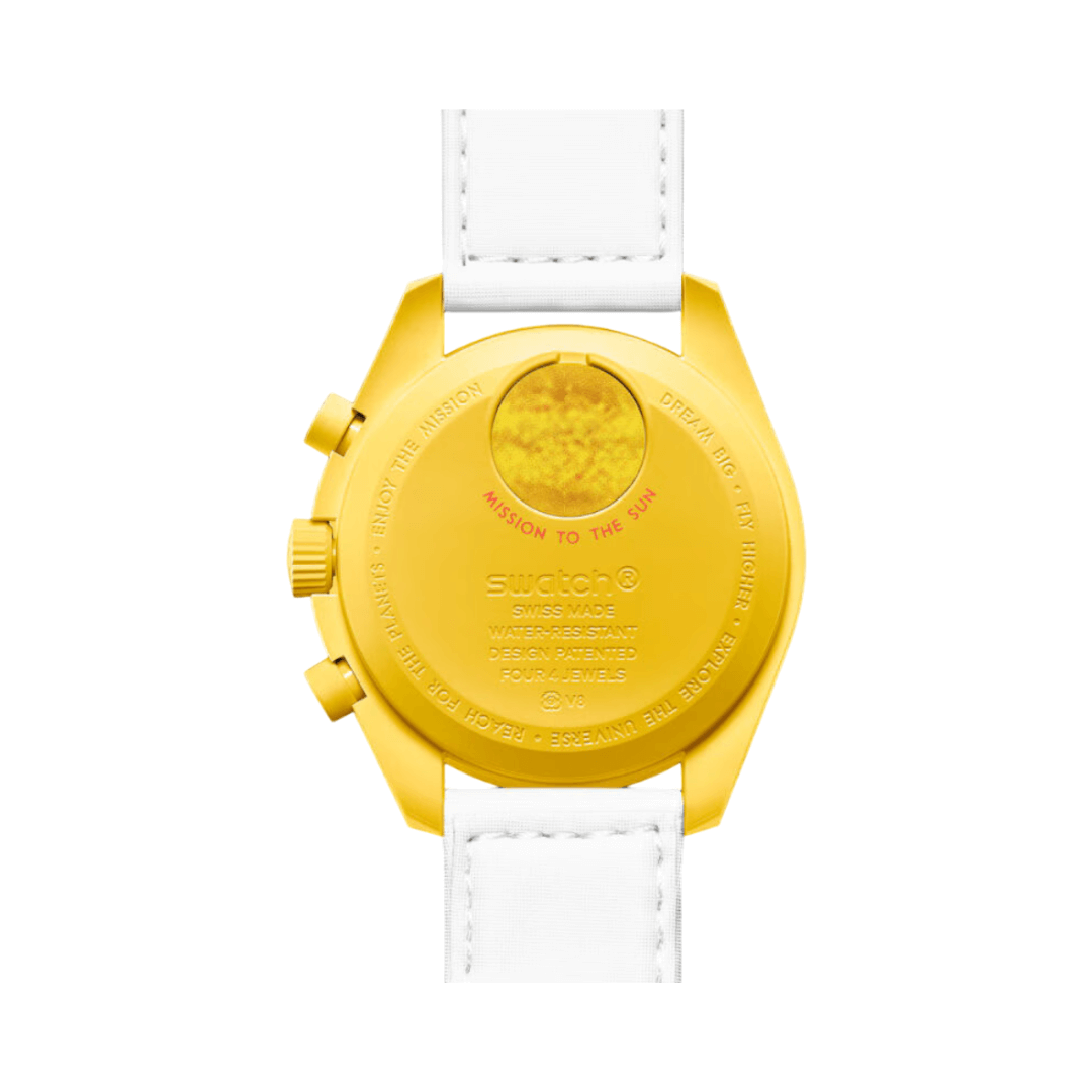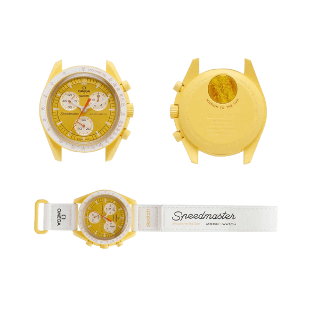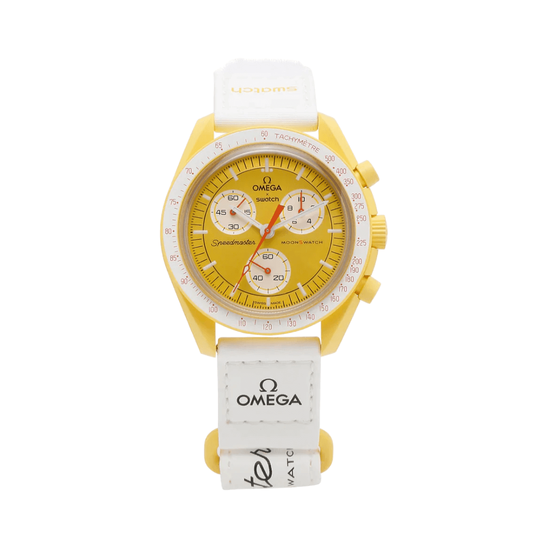 Immerse yourself in the luxury of the Omega X Swatch Mission To Sun So33J100 Moonswatch Yellow Bioceramic. Harness the power of the sun with the Omega X Swatch Mission To Sun So33J100 Yellow Bioceramic Unisex Chronometer. This vibrant yellow watch, inspired by the sun, features a stylish sun-brushed finish dial that stands out brilliantly. The watch is completed with a white velcro strap that ensures both comfort and durability. Unique Features The Omega X Swatch Mission To Sun showcases several unique features: Sun-Inspired Dial: The yellow dial and orange sundial hands reflect the radiant energy of the sun. Tachymeter Scale: The orange tachymeter scale around the bezel adds a functional and styli… Available exclusively, your trusted luxury timepiece destination.