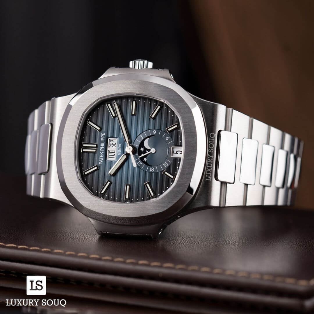 Experience luxury with the Patek Philippe Nautilus 5726/1A-014 Gradient Blue Dial Annual Calendar Moon Phases Stainless Steel. The Patek Philippe Nautilus 5726/1A-014 is an exquisite men?s watch known for its stunning design and functionality. Crafted with precision, this stainless steel timepiece features a beautiful gradient blue dial that transitions to black at the edges, creating a visually striking effect. With its annual calendar and moon-phase display, this watch combines elegance and practicality seamlessly. Design and Features The watch showcases a 40.5mm stainless steel case and a silver-tone stainless steel bracelet. It has luminescent gold applied hour markers, ensuring easy readability in various lightin… Available exclusively, your trusted luxury timepiece destination.