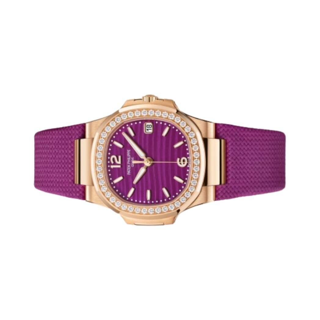 Discover the exceptional craftsmanship of the Patek Philippe Nautilus 7010R-013 Quartz Diamond Lacquered Purple Dial. Indulge in luxury with the Patek Philippe Nautilus 7010R-013, a ladies? chronometer that effortlessly blends sophistication and functionality. Dazzling Design The rose gold case, paired with a chic purple fabric strap, exudes timeless elegance. The fixed rose gold-tone bezel, adorned with diamonds, adds a touch of glamour to your wrist. Purple Radiance The purple dial features rose gold-tone hands and index-Arabic numeral hour markers. The luminescent hands and markers ensure easy readability, day or night. Quartz Precision Powered by the Patek Philippe Calibre E 23-250 S C quartz movement, th… Backed by ‘s commitment to quality and customer satisfaction.
