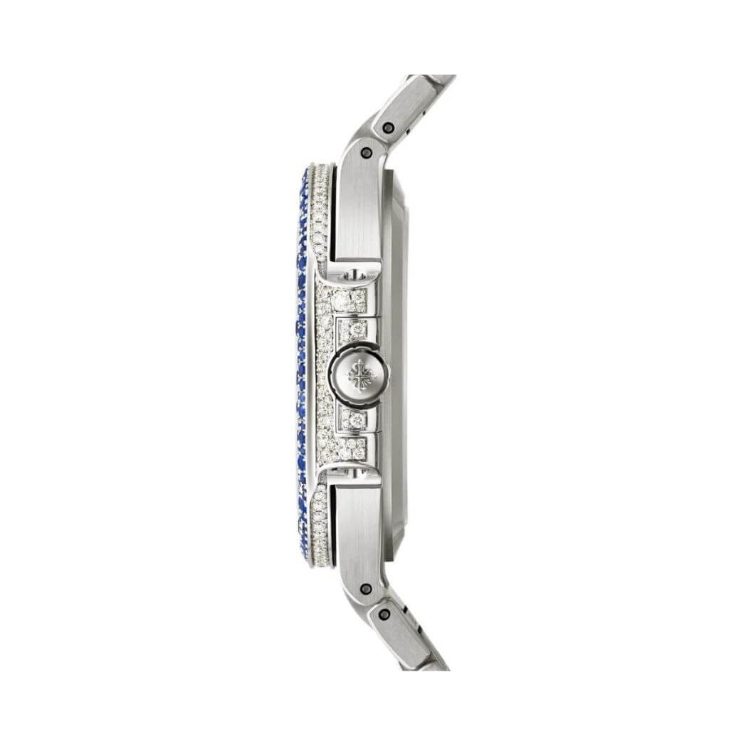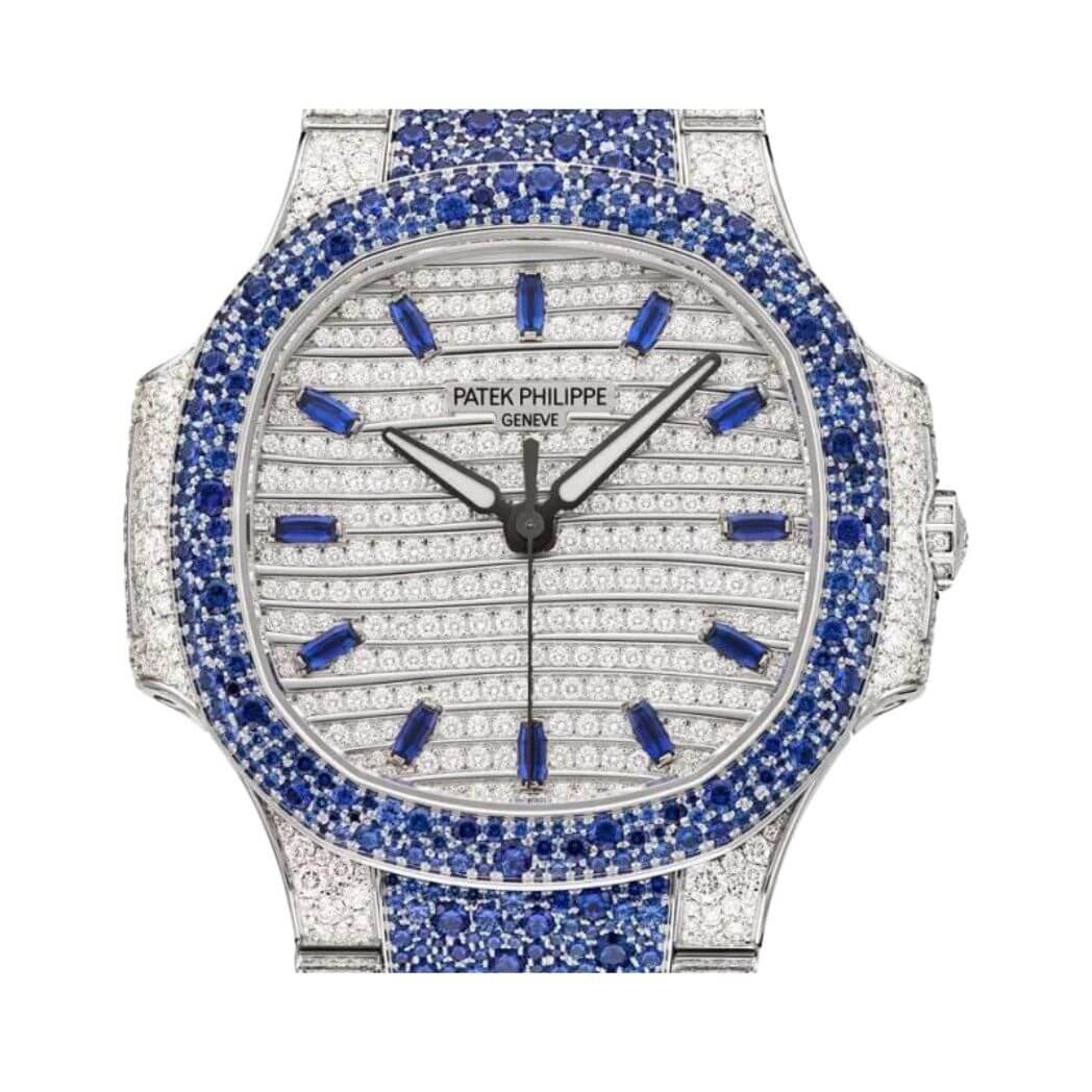 Experience luxury with the Patek Philippe Nautilus 7118/1451G-001 Haute Joaillerie Automatic Diamond. Indulge in luxury with the Patek Philippe Nautilus 7118/1451G-001, a stunning Haute Joaillerie automatic diamond ladies chronometer. This timepiece seamlessly combines elegance with precision, making it a coveted accessory for the modern woman. Dazzling Design The watch features an exquisite 18kt white gold case and bracelet, both paved with diamonds and sapphires. The fixed bezel continues the opulence, creating a radiant ensemble that catches the eye. The octagonal case shape adds a touch of uniqueness, with a diameter of 35.2mm and a slim thickness of 8.65mm. In-House Movement Powered by th… Experience exceptional service and authenticity.