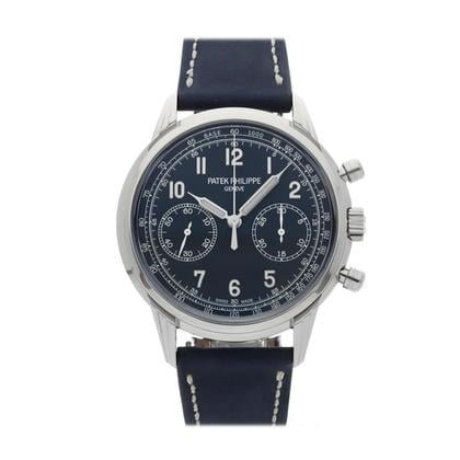 Patek Philippe 5172G-001, 41mm white gold case with blue dial and Arabic numerals. Manual winding movement with 65h power reserve and chronograph function. Completed with a matching blue leather strap and buckle clasp.