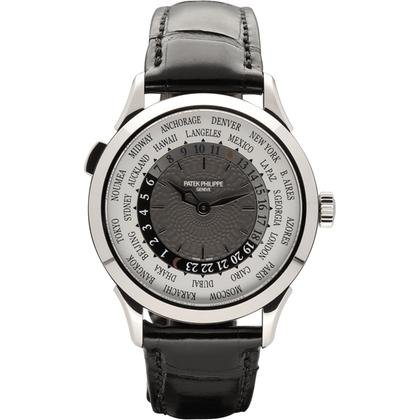 Patek Philippe World Time 5230G-014, 38.5mm white gold case with grey dial and sapphire crystal. Automatic Caliber 240 HU with world time function and 48h power reserve. Finished with a black crocodile leather strap.