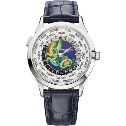 Patek Philippe World Time 5231G-001, white gold 38.5mm case with sapphire crystal, automatic Caliber 240 HU movement, world time function, and 48h power reserve. Paired with a blue crocodile leather strap for a refined luxury look.