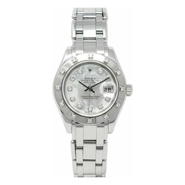 Embrace timeless elegance with the Rolex Pearlmaster 80319 White Gold 29Mm Mother Of Pear Dial12 Diamond Bezel Ladies Watch. Rolex Pearlmaster 80319 White Gold 29mm Mother of Pear Dial 12 Diamond Bezel Rolex Pearlmaster 80319 women?s timepiece features a polished solid 18k white gold case and Pearlmaster bracelet. Polished solid 18k white gold bezel set with 12 diamonds. Silver dial with diamond hour markers. Date displayed under cyclops lens in window at 3 o?clock with instantaneous date setting. Powered by the Rolex Caliber 2235 self-winding automatic COSC Superlative Chronometer certified movement which boasts a 48 hour power reserve, beats at 28,800 vph and contains 31 jewels. A scratch resistant sapphire crysta… Available exclusively, your trusted luxury timepiece destination.