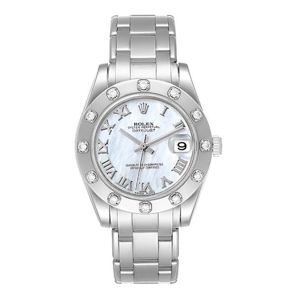 Celebrate exceptional design with the Rolex Pearlmaster 81319 Midsize Mother Of Pearl Roman 34Mm White Gold Diamond Ladies Watch. Rolex Pearlmaster 81319 Midsize Mother of Pearl Roman 34mm White Gold Diamond Ladies Rolex Pearlmaster Midsize MOP White Gold Diamond Ladies Horological masterpiece 81319 features chronometer self-winding movement with quickset date function. 18k white gold oyster case 34.0 mm in diameter. Rolex logo on a crown. 18k white gold diamond bezel. Scratch resistant sapphire crystal with Cyclops magnifier. Mother of pearl dial with roman numerals. Date calendar at 3 o?clock aperture. 18k white gold Pearlmaster bracelet with hidden clasp. Fits 6.5″ wrist. Timepiece SPECIFICATIONS: Brand: Rolex Collect… Explore our complete luxury watch collection.