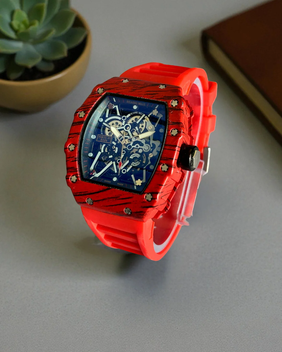The Richard Mille RM 12-01 Tourbillon in Red Quartz TPT is a striking luxury timepiece inspired by architectural bridge structures. Featuring a lightweight yet highly durable Quartz TPT case, skeletonized dial, and advanced tourbillon movement, this watch showcases exceptional engineering and modern design. Built for performance, comfort, and exclusivity, it offers outstanding shock resistance, precision, and bold aesthetics?making it the perfect choice for collectors and enthusiasts seeking innovation and high-end craftsmanship in one iconic watch.