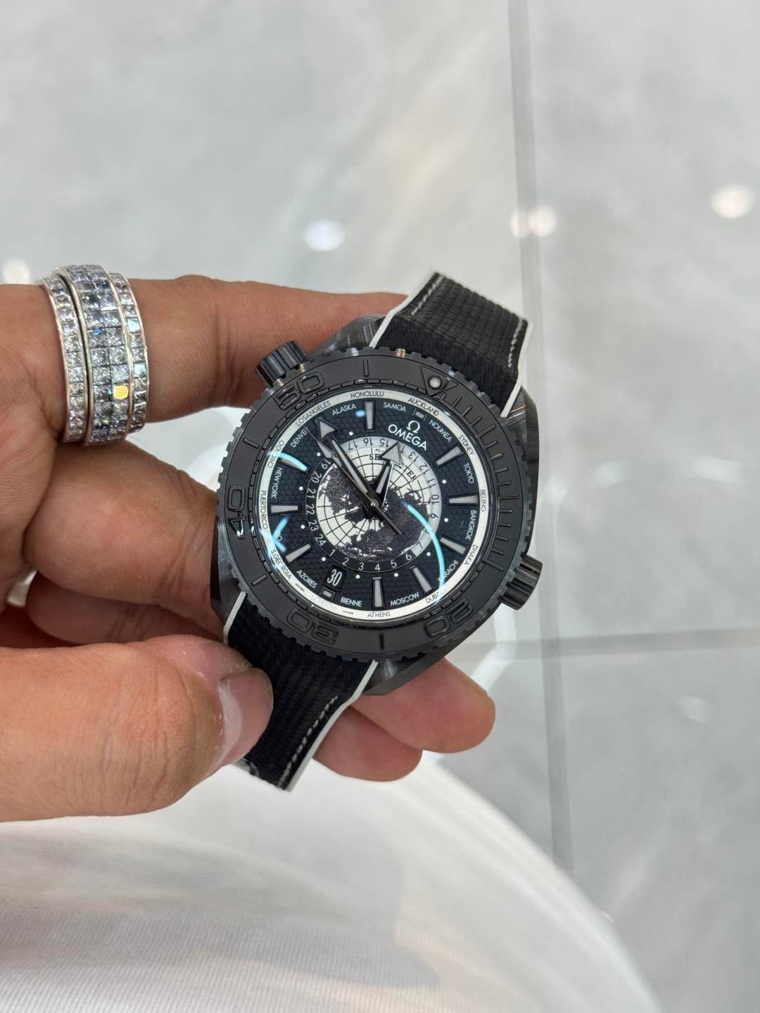At the center of the dial, a titanium map of the Earth viewed from the North Pole showcases OMEGA?s advanced laser-ablation technology, surrounded by a 24-hour day and night indicator. The outer dial includes a black honeycomb pattern, luminous indexes, and a ring of global city time zones, including OMEGA?s home city Bienne.