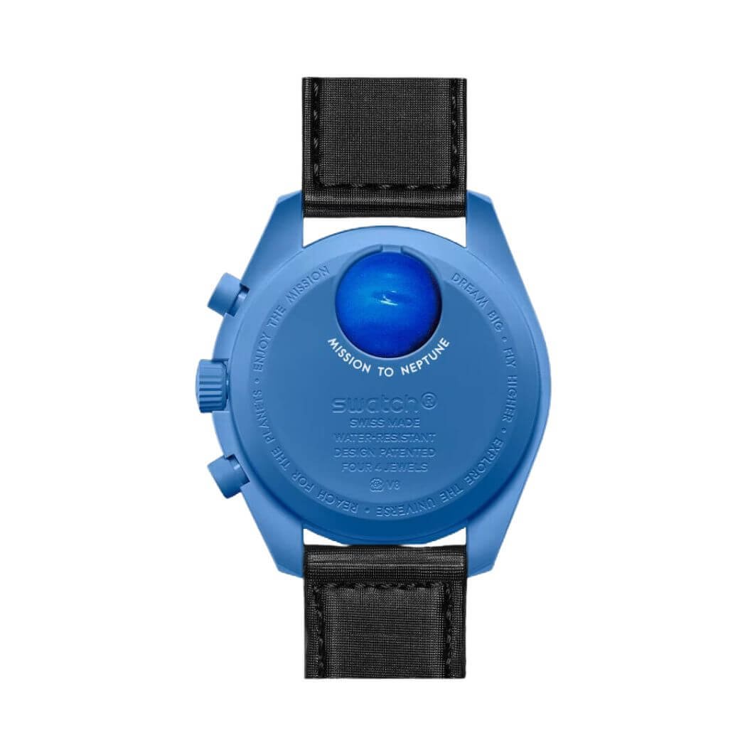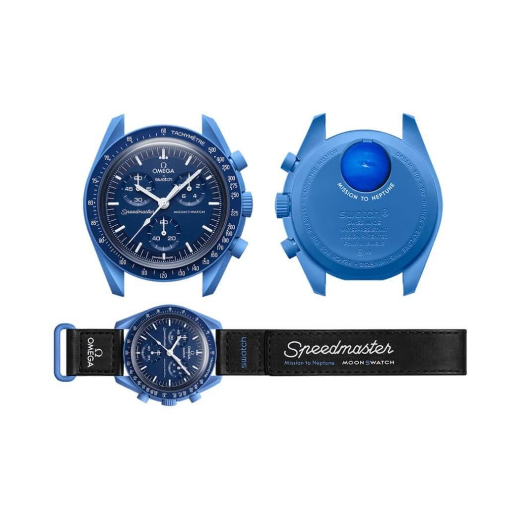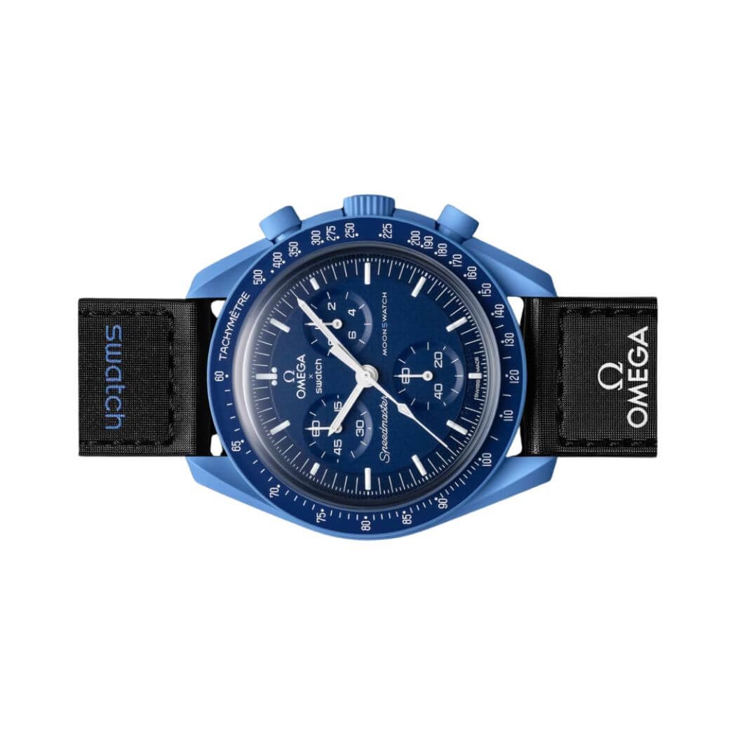 Experience luxury with the Omega X Swatch Mission To Neptune So33N100 Moonswatch Blue Bioceramic. The Omega X Swatch Mission To Neptune So33N100, a fusion of Swatch?s innovative BIOCERAMIC material and iconic Omega Speedmaster Moonwatch design, takes you on a journey inspired by Neptune?s deep blue hues. The horological masterpiece features a 42MM BIOCERAMIC case, bringing a touch of celestial charm to your wrist. Contrast and Detail The deep navy blue tones and black VELCRO? strap create a striking contrast, making this watch perfect for lovers of the dark. White chronograph seconds hand, subdial hands, and tachymeter scale add a touch of brightness, showcasing attention to detail in ever… Backed by ‘s commitment to quality and customer satisfaction.